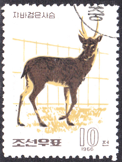 In einer Serie "Hirsche aus dem Zoologischen Garten von Pjöngjang" ist in Korea-Nord diese Marke (MiNr 751 A) mit einem Indischen Muntjak (Muntiacus muntjak) erschienen.