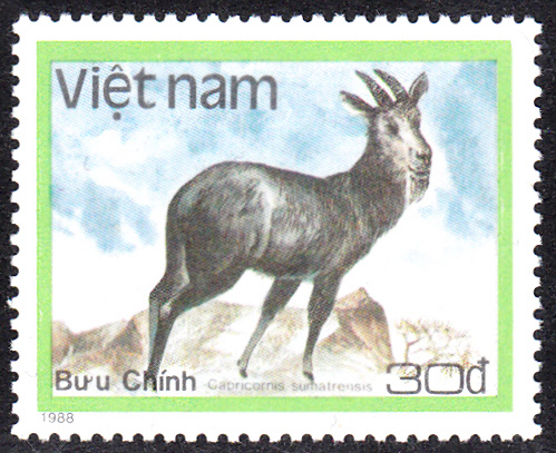 Auf dieser Marke aus Vietnam (MiNr 1985) wird ein Südlicher Serau (Capricornis sumatraensis) gezeigt.