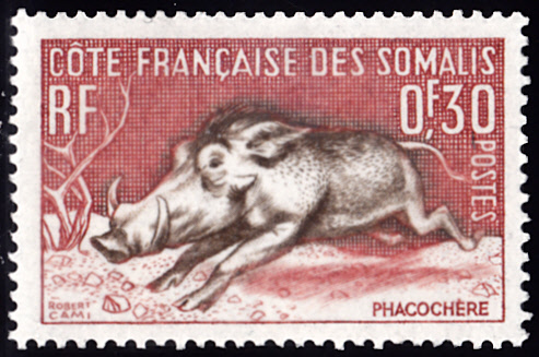 Hier auf dieser Marke aus Angola (Minr 383) ist eine Unterart des Warzenschweines (Phacochoerus africanus) zu sehen.