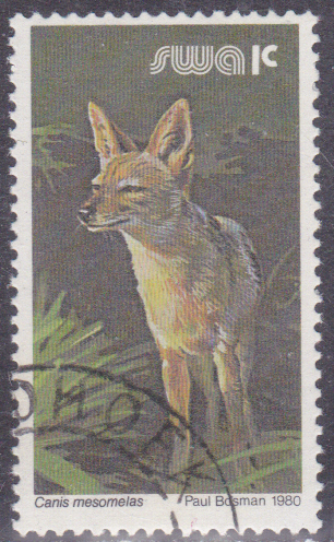 Aus Südwestafrika kommt diese Marke (MiNr 476) mit einem Schabrackenschakal (Lupulella mesomelas, Syn.: Canis mesomelas).