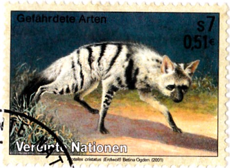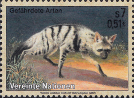 Aus einer Serie "Gefährdete Arten Fauna" der Vereinten Nationen Wien kommt diese Marke (MiNr 329) mit einem Erdwolf (Proteles cristata).
