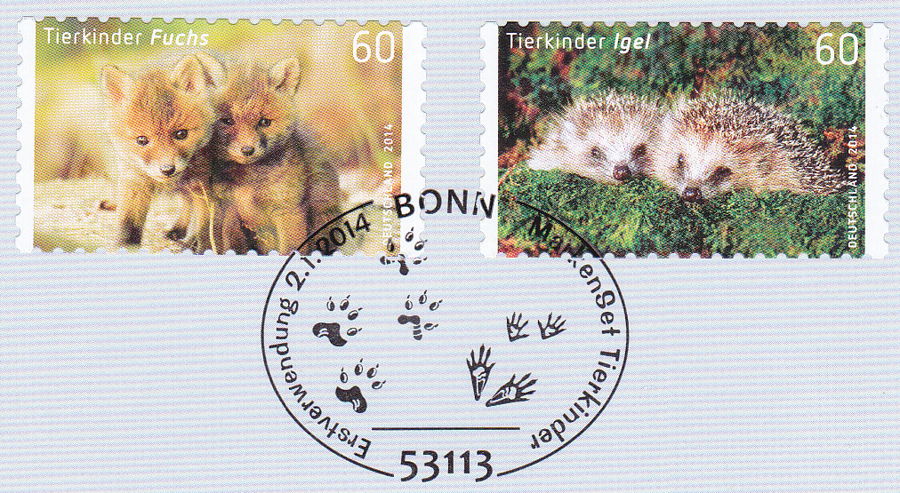 Am Ausgabetag der beiden Marken "Tierbabys" Rotfuchs (Vulpes vulpes) (MiNr 3053) und Europäischer Igel (Erinaceus europaeus) (MiNr 3054) wurde in Bonn auch ein Erstverwendungsstempel eingesetzt.