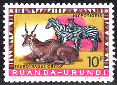 Diese Marke aus einer Serie aus Ruanda-Urundi (MiNr 172 A) zeigt vorne auch eine Elenantilope (Taurotragus oryx).