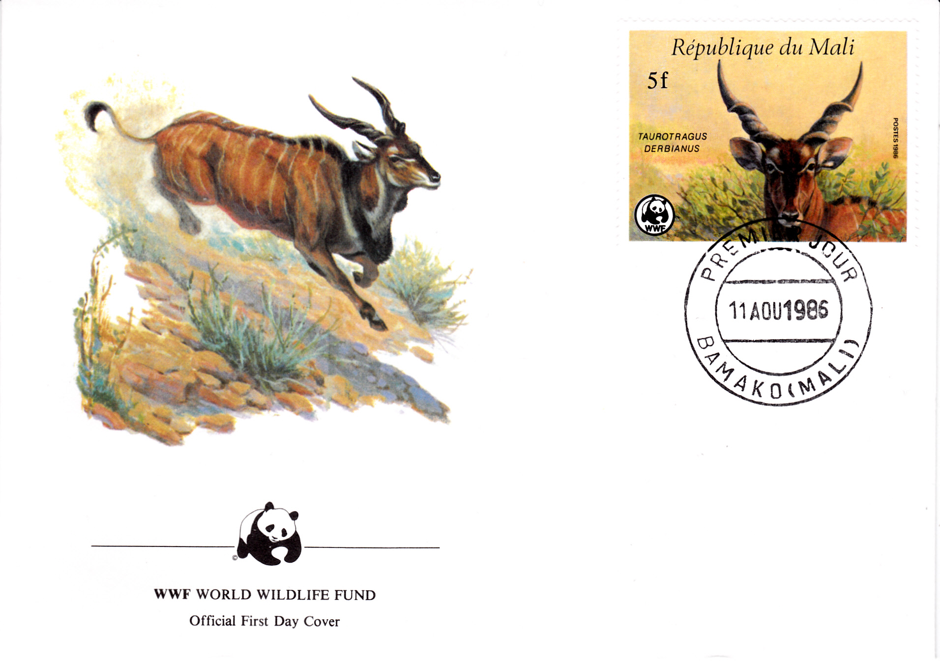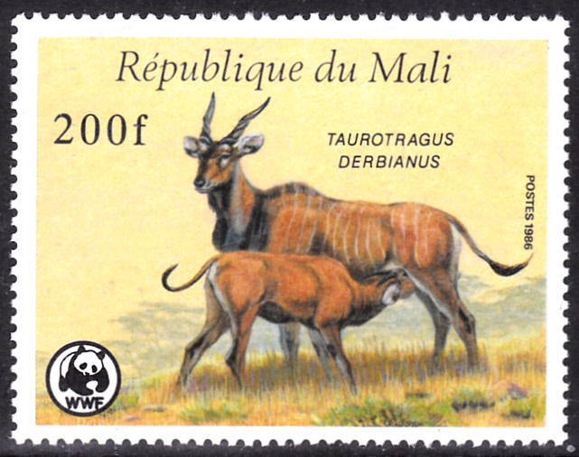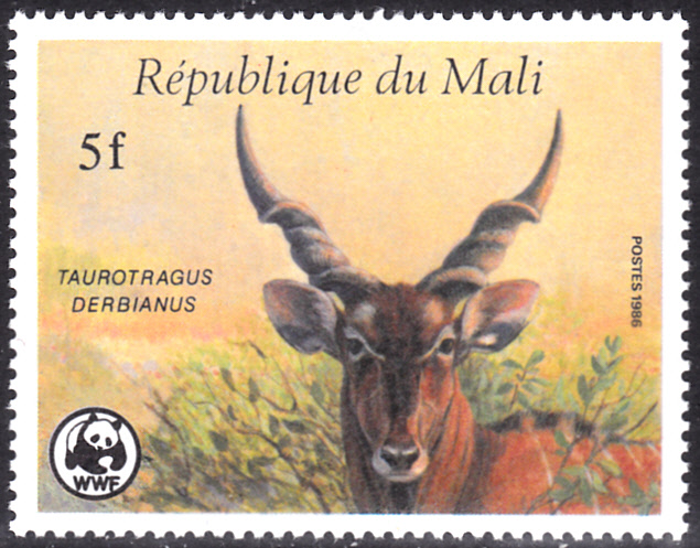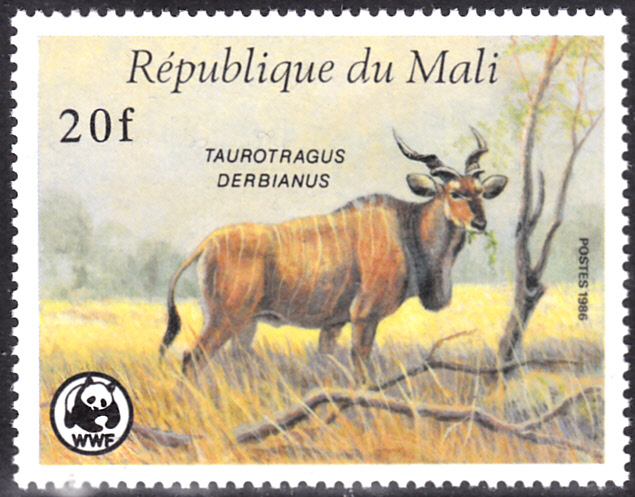 Auf dieser Marke aus Mali (MiNr 1078) bildet den Kopf einer Riesen-Elenantilope (Taurotragus derbianus) ab. Im Michel wird als Name Waldelen (Taurotragus oryx derbianus) genannt.