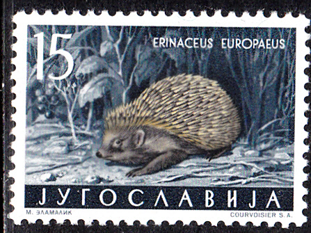 Einen weiteren Igel (Erinaceus europaeus) sehen wir auf dieser Marke (MiNr 917) aus einer jugoslawischen Serie mit Säugetieren.