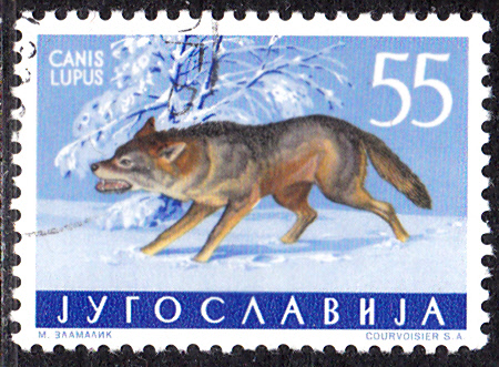 Diese Marke aus Jugoslawien (MiNr 923) zeigt einen Wolf (Canis lupus ) in einer Winterlandschaft.