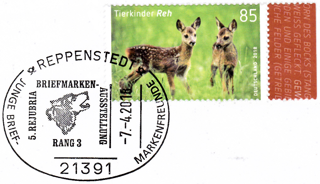 Im Sonderstempel vom 7.4.2018 aus Reppenstedt wird das Signet der Briefmarkenausstellung mit einem Wolfskopf gezeigt.