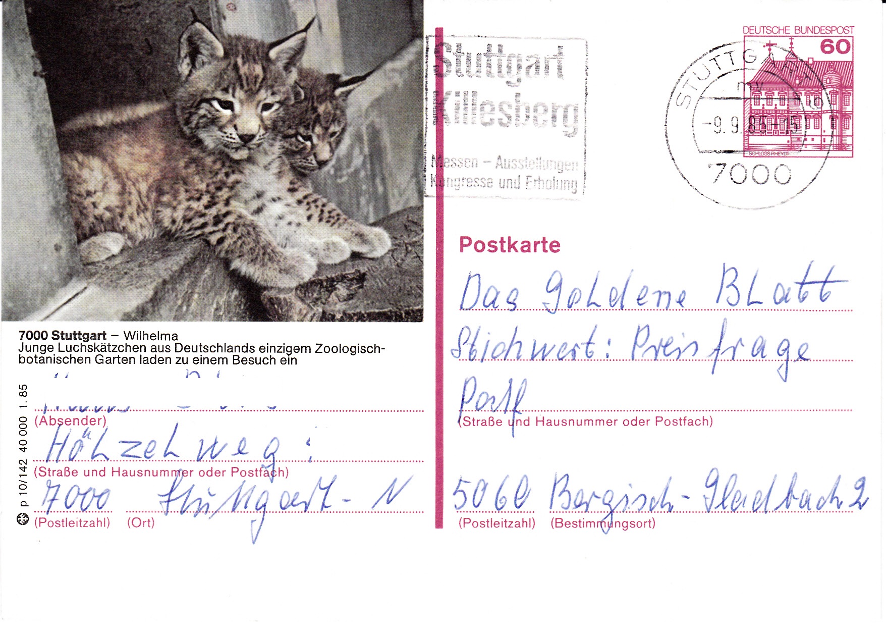 Bildpostkarte MICHEL P 138 der Teilserie = Auflage "p" (1985) mit zwei jungen Luchskätzchen aus der Wilhelma in Stuttgart.
