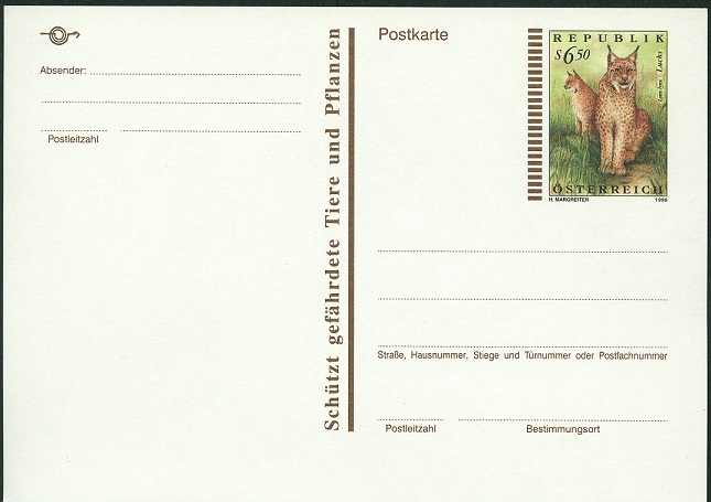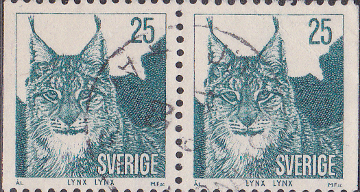 In Schweden ist 1973 in einem Markenheftchen "Tierschutz" eine Marke mit der Abbildung eines Luchses (Lynx lynx) erschienen. Hier ein Paar aus diesem Heftchen (MiNr 822 yDl / 822 yDR). Die Marke gibt es in zwei Papierarten: x = normales Papier, y = Papier fl.
