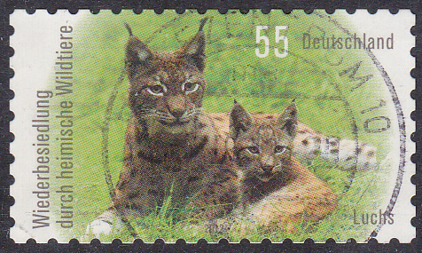 Bei der Deutschen Post AG erschien 2012 in einer Ausgabe "Wiederbesiedlung durch heimische Wildtiere" auch eine Marke mit einem Nordluchs (Lynx lynx). Die Marke gibt es nassklebend und selbstklebend. Hier eine selbstklebende Marke (MiNr 2921).