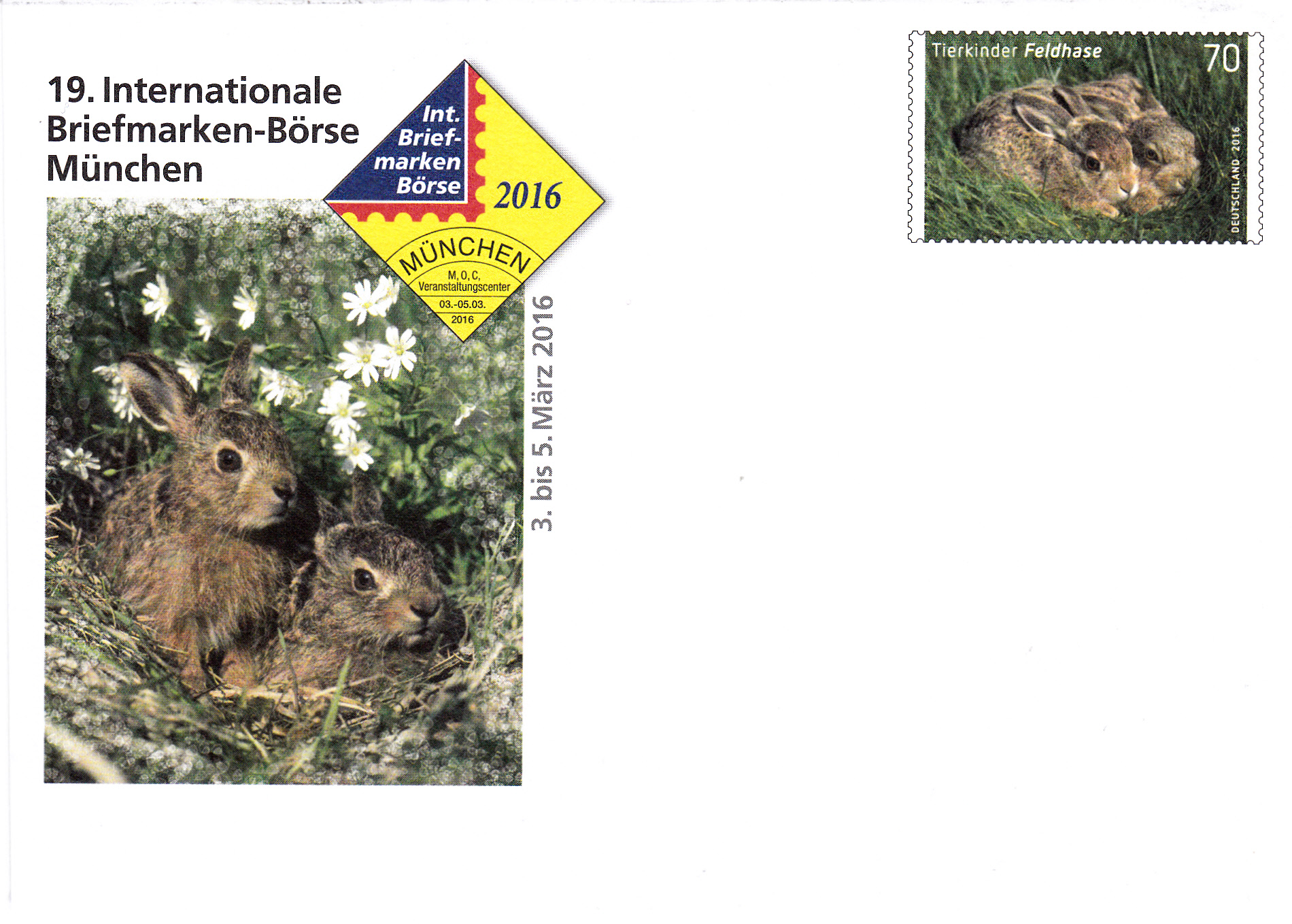 Ganzsache zur Briefmarken-Börse München mit dem Wertzeicheneindruck der Marke mit den zwei Feldhasenkinder (MiNr 3217) mit dem zum Umschlag passenden Sonderstempel zur Briefmarkenbörse in München vom 3.32016.