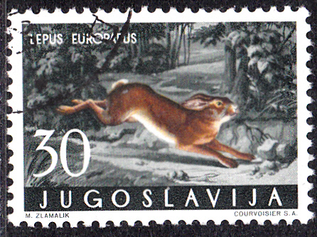 Ein weiterer Feldhase (Lepus europaeus) ist auf dieser Marke aus Jugoslawien (MiNr 920) zu sehen.