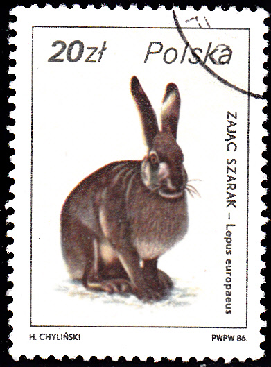 Hier eine Marke aus Polen (MiNr 3023) mit einem Europäischen Feldhasen (Lepus europaeus). Die Marke erschien in einer Serie "Jagdbare Wildtiere".