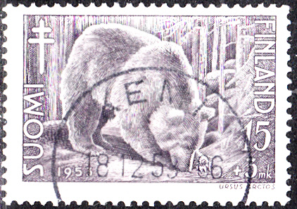 Diese Marke mit einem Braunbär ist 1953 in Finnland (MiNr 419) in einer Serie "Bekämpfung der Tuberkulose" erschienen.