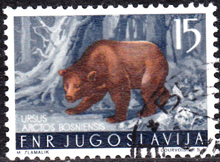 Aus Jugoslawien kommt dies Marke (MiNr 741) mit einem Braunbär (Ursus arctos).