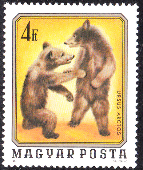 Diese Marke aus Ungarn (MiNr 1729 A) zeigt uns einen Braunbären (Ursus arctos) aus dem Zoo Budapest.