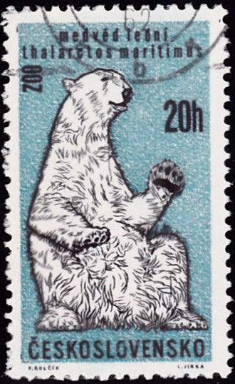 Einen sitzenden Eisbären (Ursus maritimus) sehen wir auf dieser Marke aus der Tschechoslowakei (MiNr 1335).