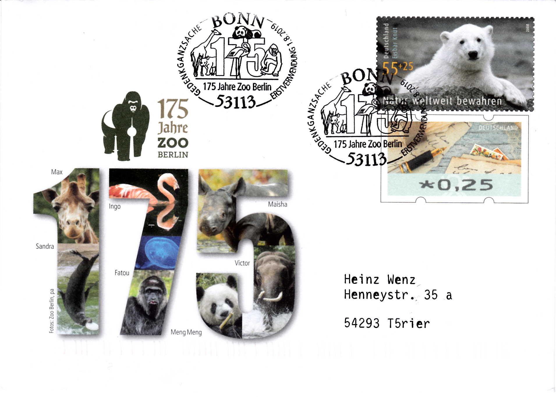 Zum Jubiläum "175 Jahre Zoo Berlin" erschien eine Gedenkganzsache ebenfalls mit dem Wertstempel der Zuschlagsmarke "Umweltschutz" aus dem Jahre 2008 mit dem Eisbären "Knut" (MiNr 2656) und einer Automatenmarke zu 25 Cent (MiNr 8).