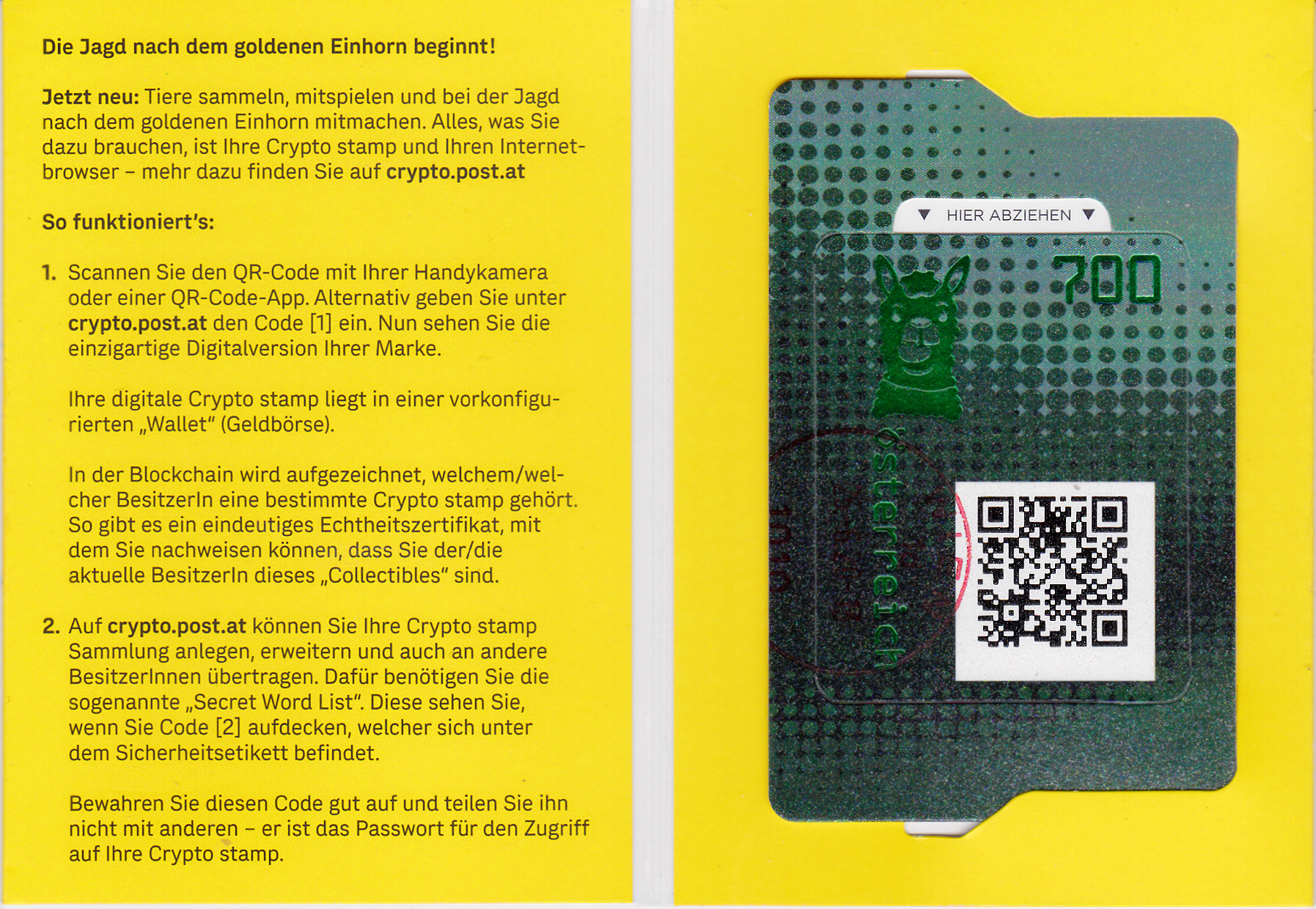 Eine Kryptomarke aus Österreich (MiNr 3537) zeigt den Kopf von einem Lama. Die selbstklebende "Marke" ist in einem "Block" erschienen (MiNr Block 113).
