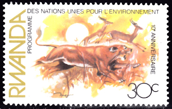 Eine Marke aus Ruanda (MiNr 1197) aus der Serie "10 Jahre Umweltschutzprogramm der Vereinten Nationen" zeigt eine Löwin (Panthera leo) bei der Jagd auf Gazellen.