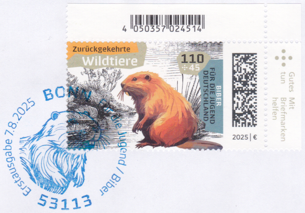 Brief mit der Jugendmarke 2025 zu 110+45 Cent (MiNr 39189) der Deutschen Post mit dem Europäischen Biber (Castor fiber) mit dem Ersttagsonderstempel aus Bonn.
