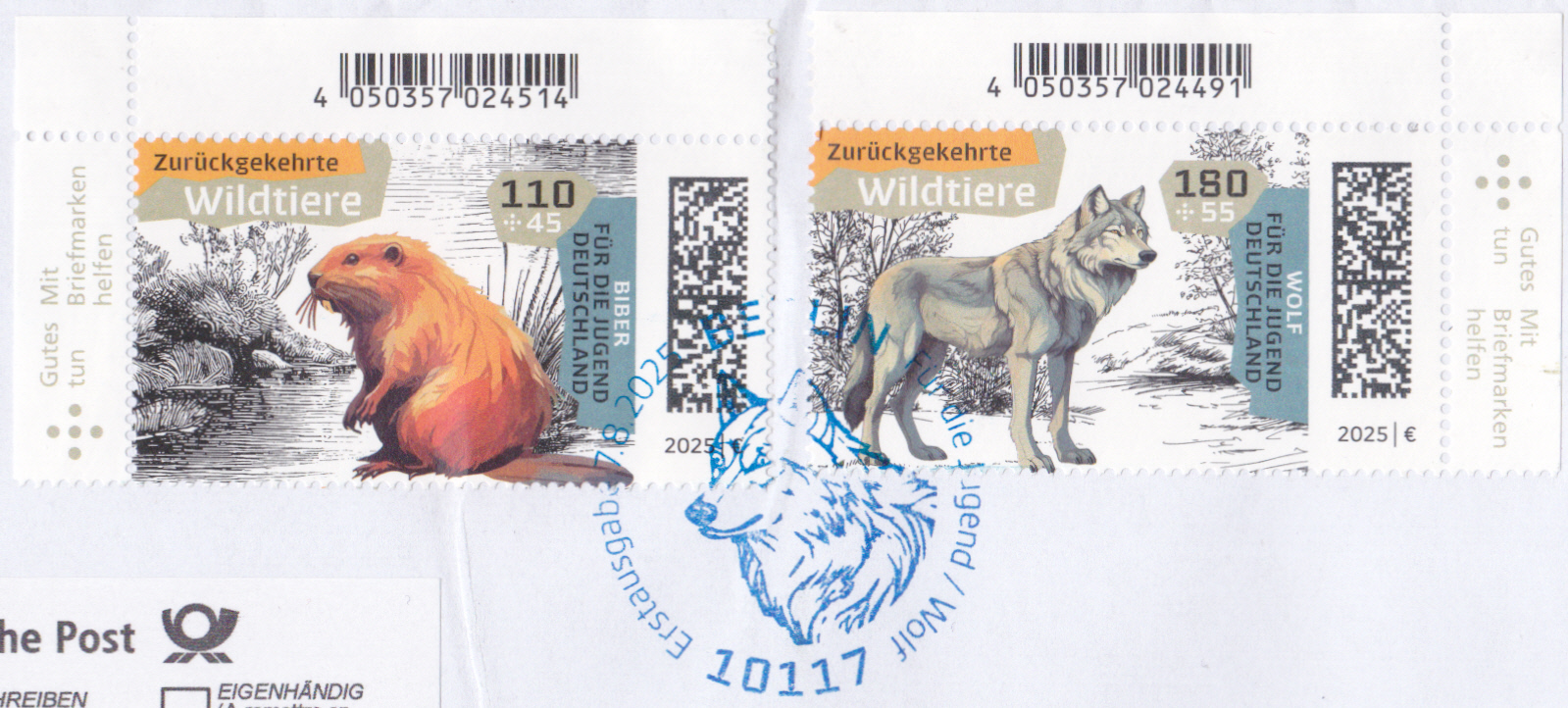 Ministerkarte des Bundesministers für Finanzen mit je einer Marke der Jugendmarken 2025 (MiNr 3918-3920) mit Motiven zum Thema "Zurückgekehrte Wildtiere" und den beiden Ersttagsonderstempel Bonn und Berlin.