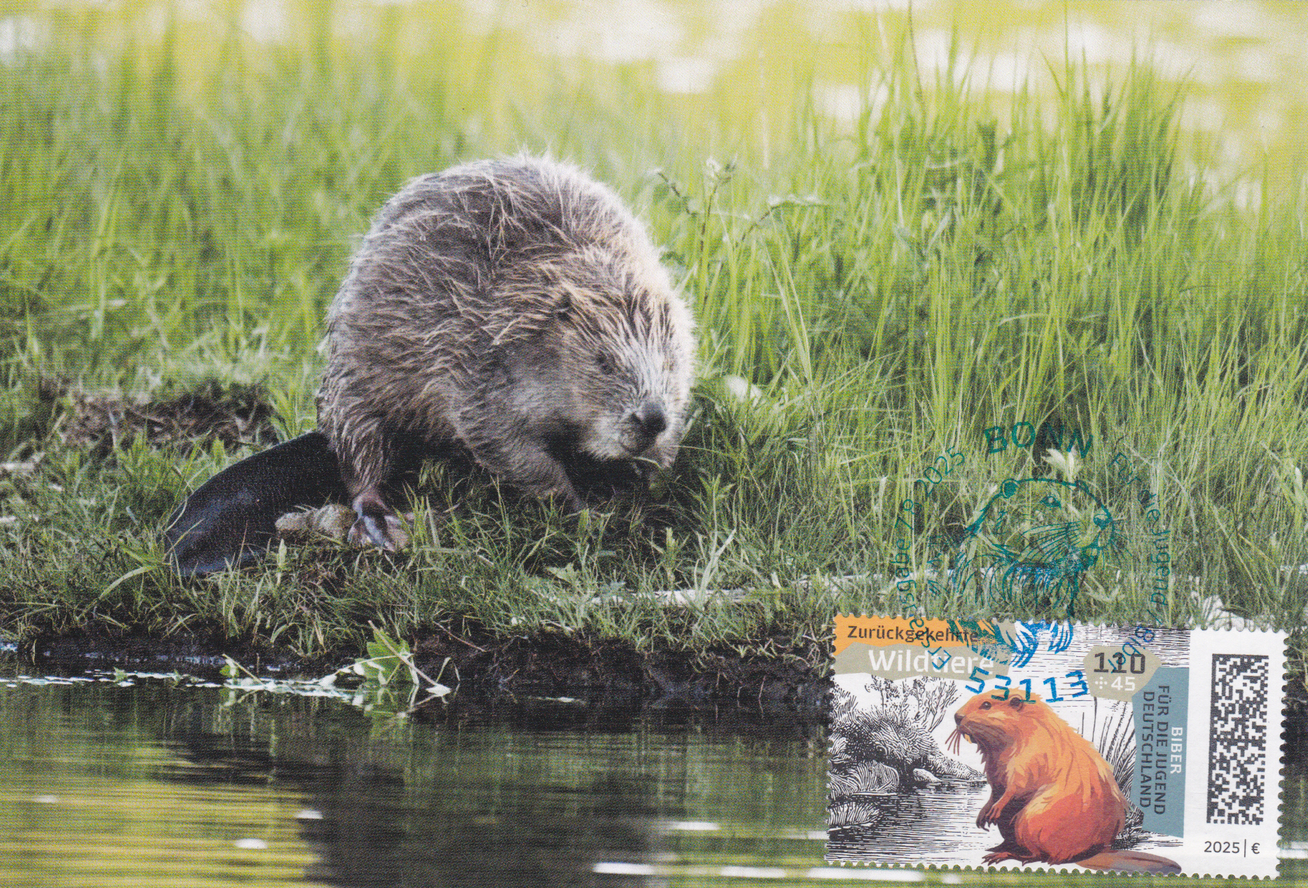 Maximumkarte mit der Jugendmarke 2025 zu 110+45 Cent (MiNr 3919) der Deutschen Post mit dem Europäischen Biber (Castor fiber) und mit dem Ersttagsonderstempel aus Bonn.