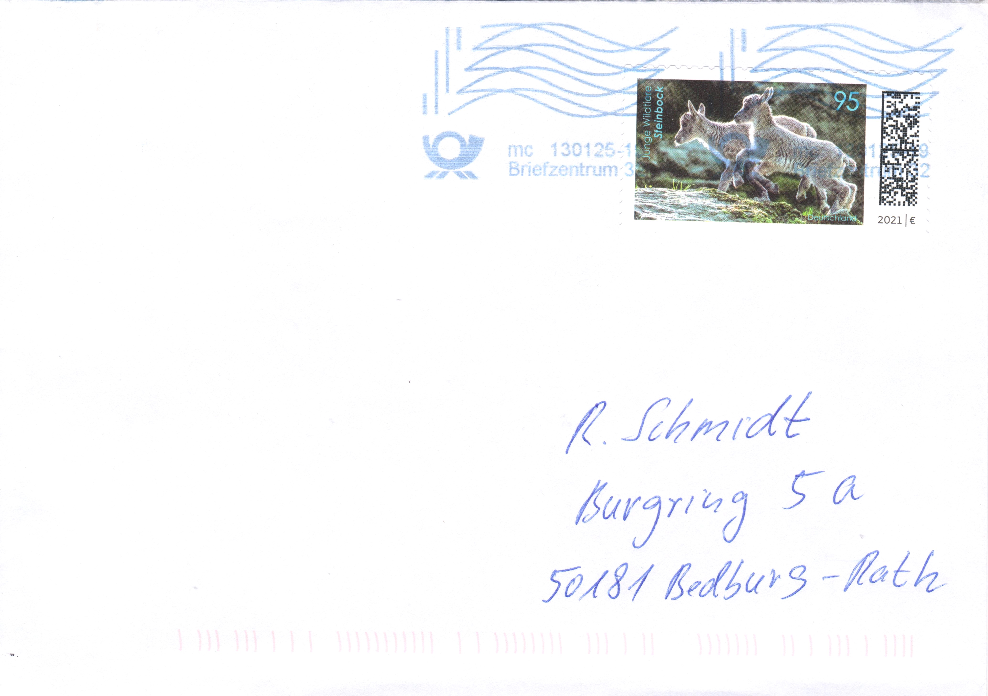Einzelfrankatur des Postwertzeichens mit den jungen Alpensteinböcken (Capra ibex) als selbstklebende Marke, MiNr. 3629, aus einem Folienblatt oder als Einzelmarke aus Folienbogen: