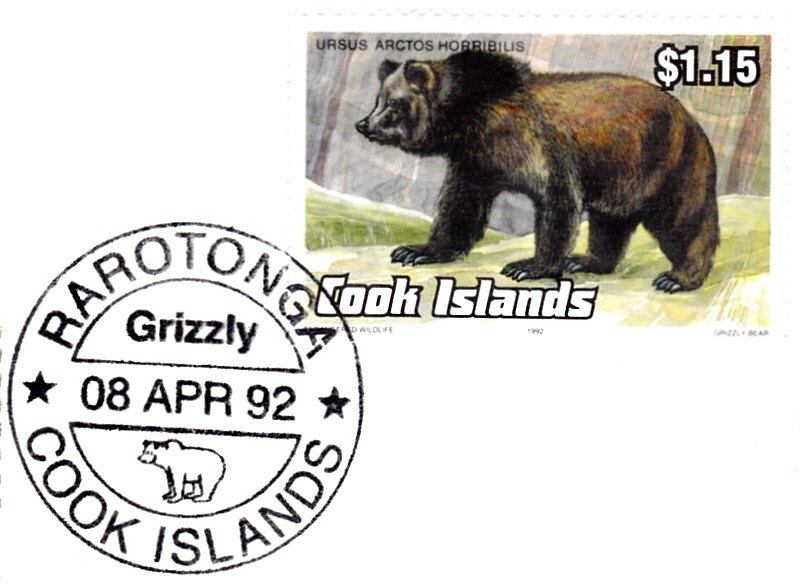 Auf einer Marke der Cook-Inseln (MiNr 1343) aus einer Serie "Gefährdete Tiere" wird ein Grizzlybär (Ursus arctos horribilis), eine Unterart des Braunbären, gezeigt. Hier eine Marke mit dem zur Marke passenden Ersttagstempel.