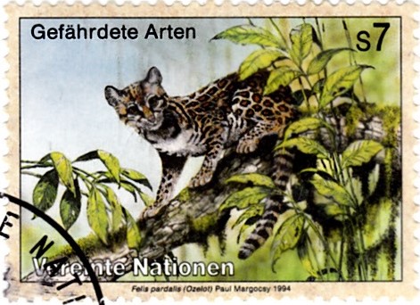 Auf einer weiteren Marke der Postverwaltung der UN Wien (MiNr 264) ist ein Ozelot (Leopardus pardalis) zu sehen.