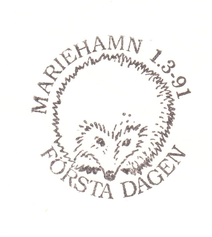 Dieser Ersttagsstempel (FÖRSTA DAGEN) aus Aland vom 01.03.1991 zeigt einen Igel: