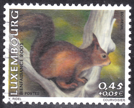 Auf dieser Marke der Deutschen Post (MiNr 3798) zeigt eine kubistische Darstellung zweier Eichhörnchen (Sciurus vulgaris) mit Eichel in einer Winterlandschaft. Hier bilde ich Eckrandstück mit EAN-Codier ab ab.