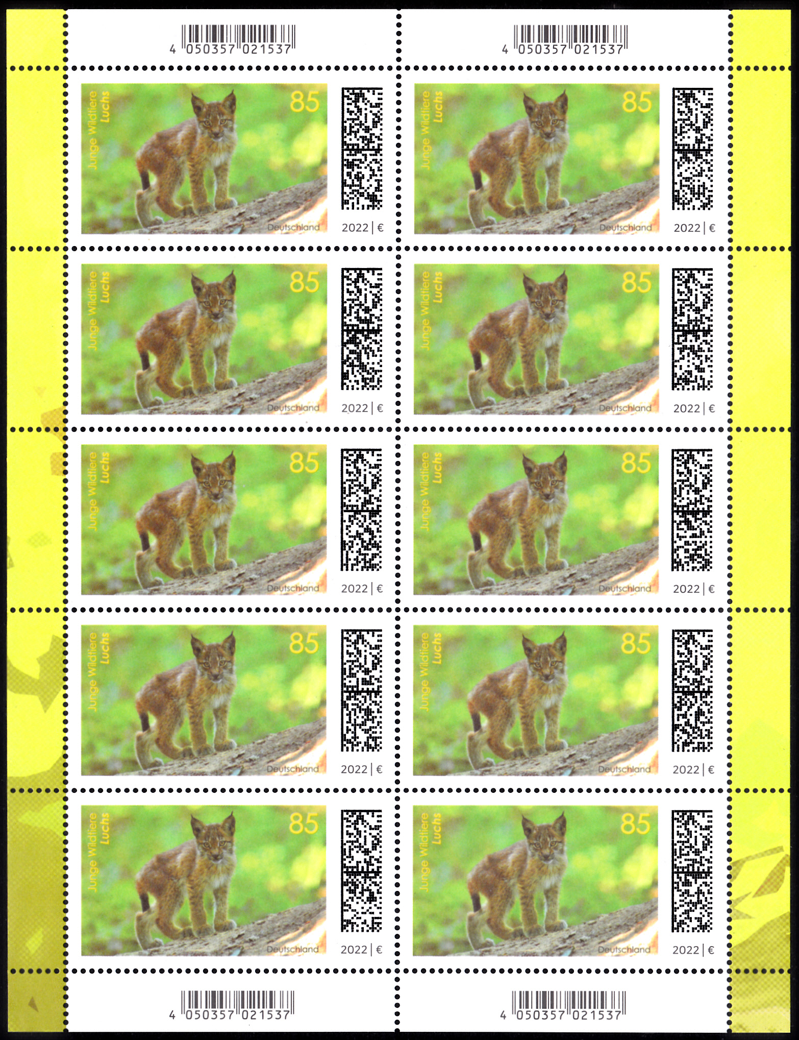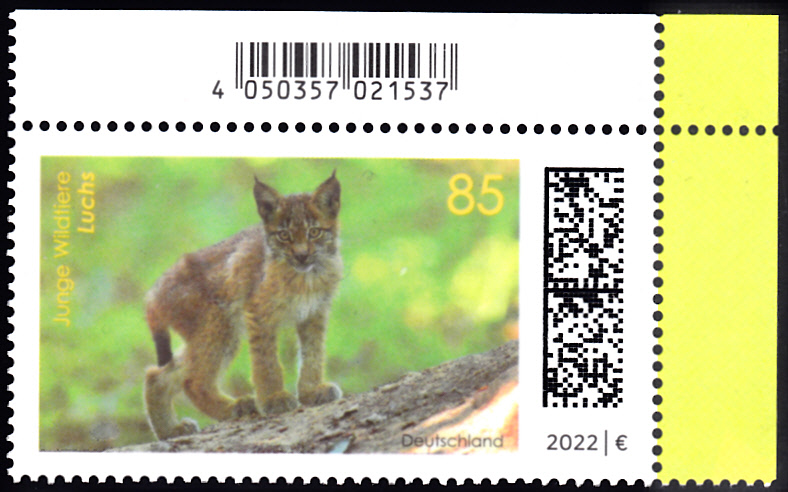 In der Serie "Tierbabys" ist bei der Deutschen Post auch eine Marke (MiNr 3682) mit einem jungen Eurasischen Luchs (Lynx lynx) erschienen. Hier zeige ich ein Eckrandstück mit EAN-Codierung.