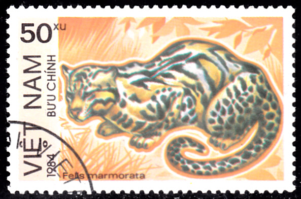 Auf dieser Marke aus Vietnam (MiNr 1412) wird die hier schon kurz beschrieben Marmorkatze (Pardofelis marmorata) gezeigt.