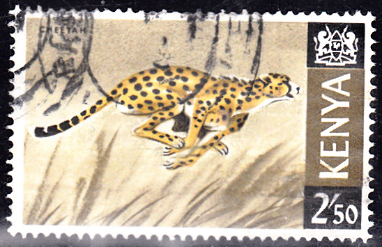 Auf dieser Marke aus Kenia (MiNr 30) läuft ein Gepard (Acinonyx jubatus) durch das Markenbild.