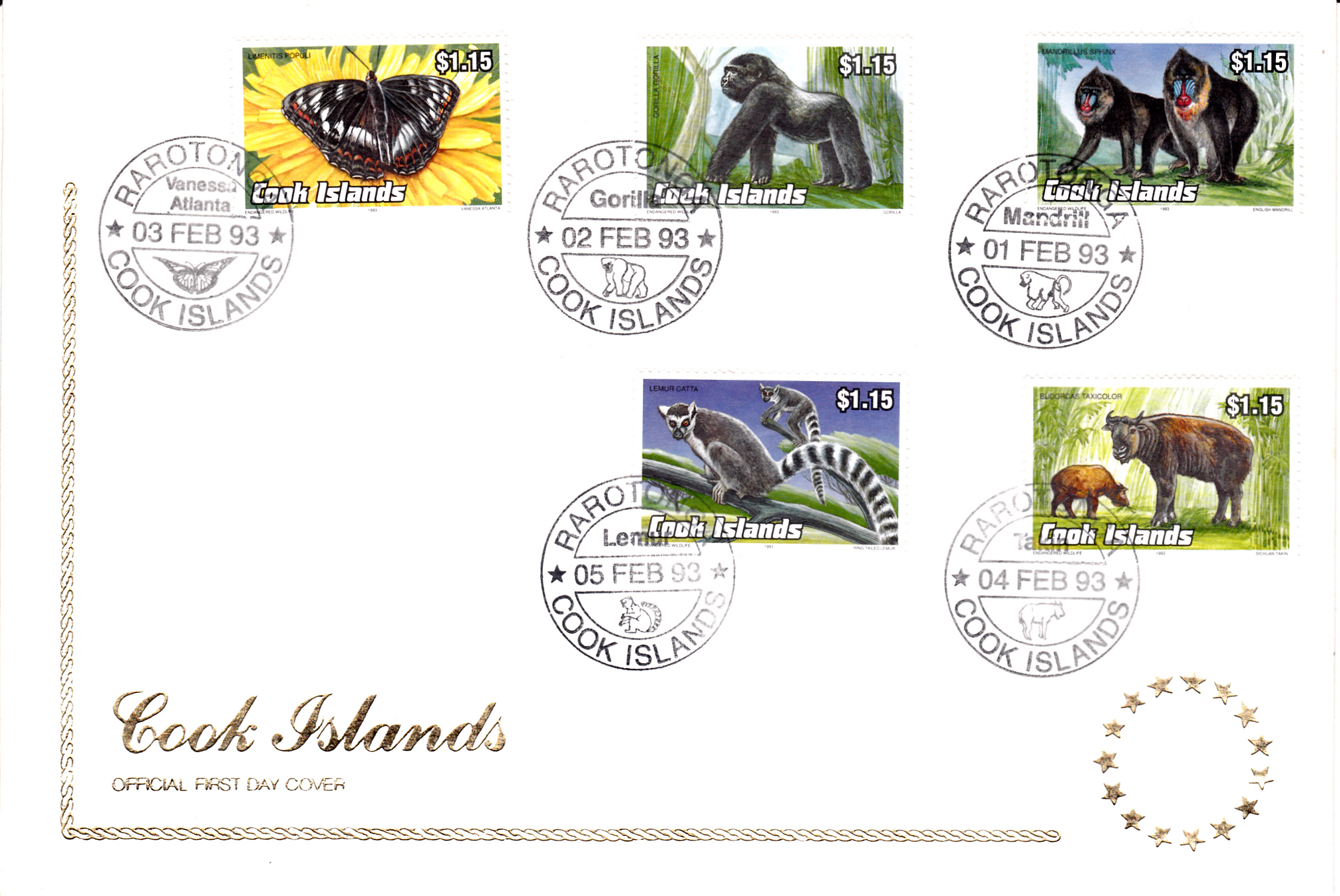 Auf einer Marke aus der gleichen Serie der Cook-Inseln (MiNr 1386) ist ein Gorilla (Gorilla gorilla) abgebildet. Hier eine Marke mit dem zur Marke passenden Ersttagstempel.