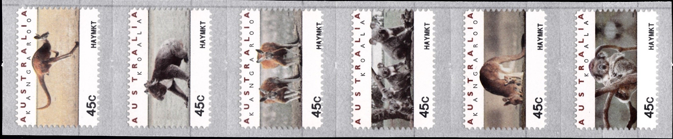 Diese sechs Marken befinden sich in wiederholender Folge auf der Trägerfolienrolle. Die Trägerfolienabschnitte der einzelnen Marken hängen an einem ca. 1 mm breiten Steg zusammen. Hier zeige ich einen kompletten Sechserstreifen.