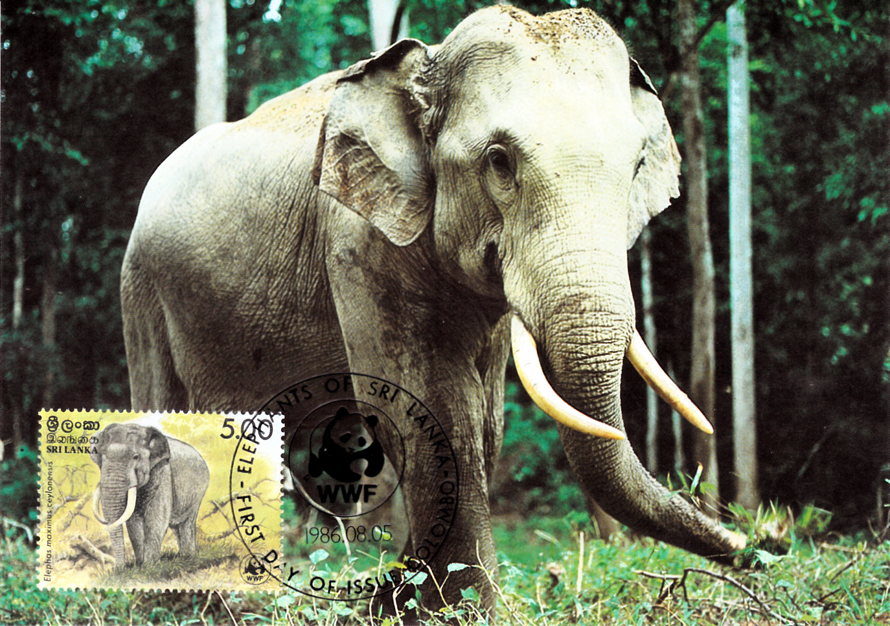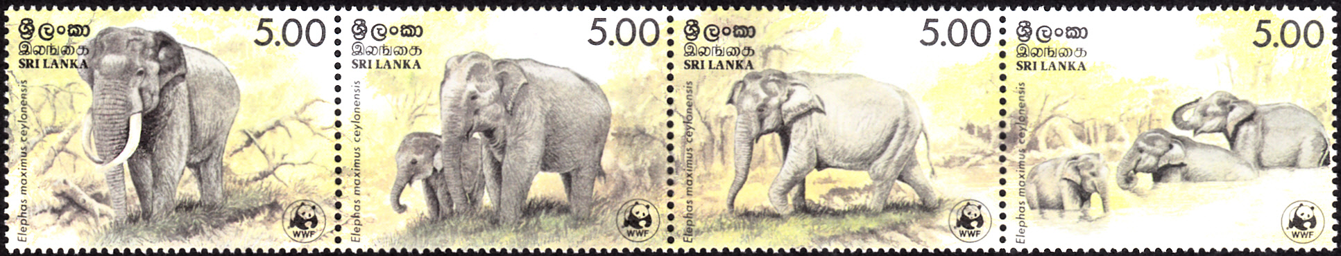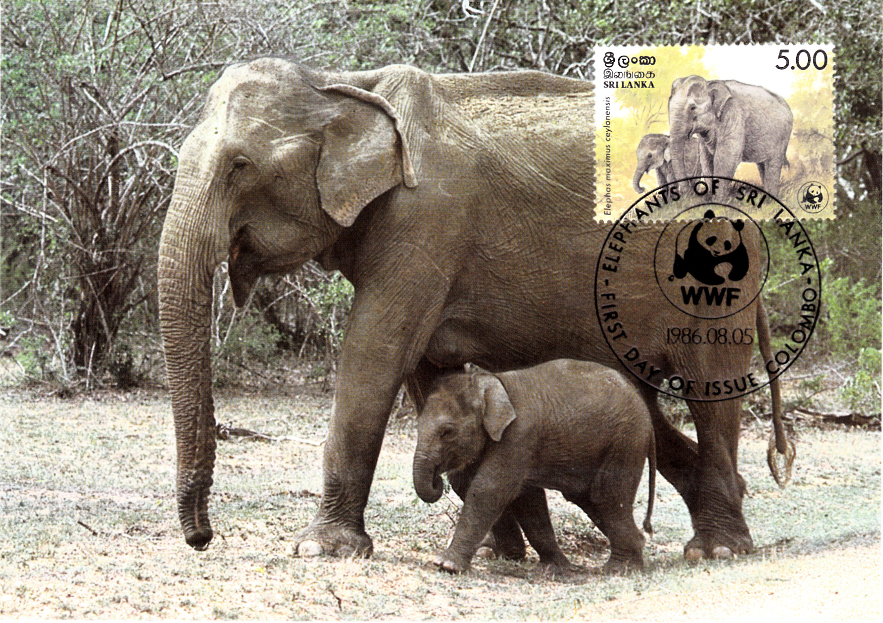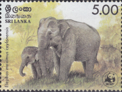 Diese Marke aus Sri Lanka (MiNr 754) zeigt eine Elefantenkuh mit einem jungen Elefanten der Unterart Sri-Lanka-Elefant (Elephas maximus maximus).