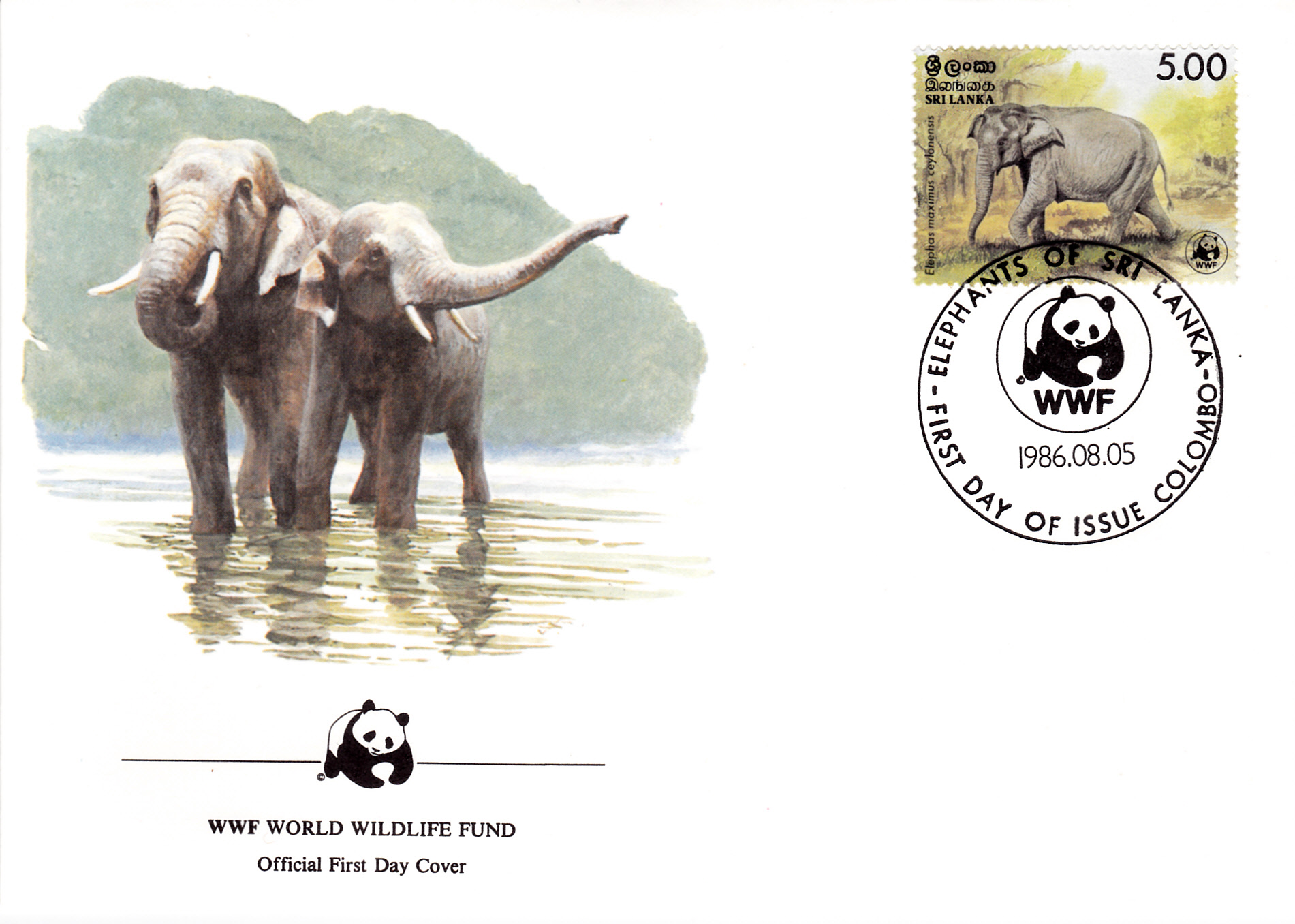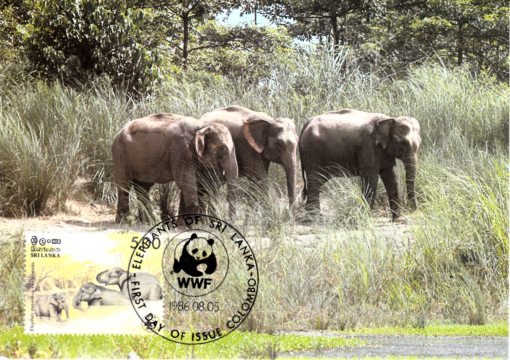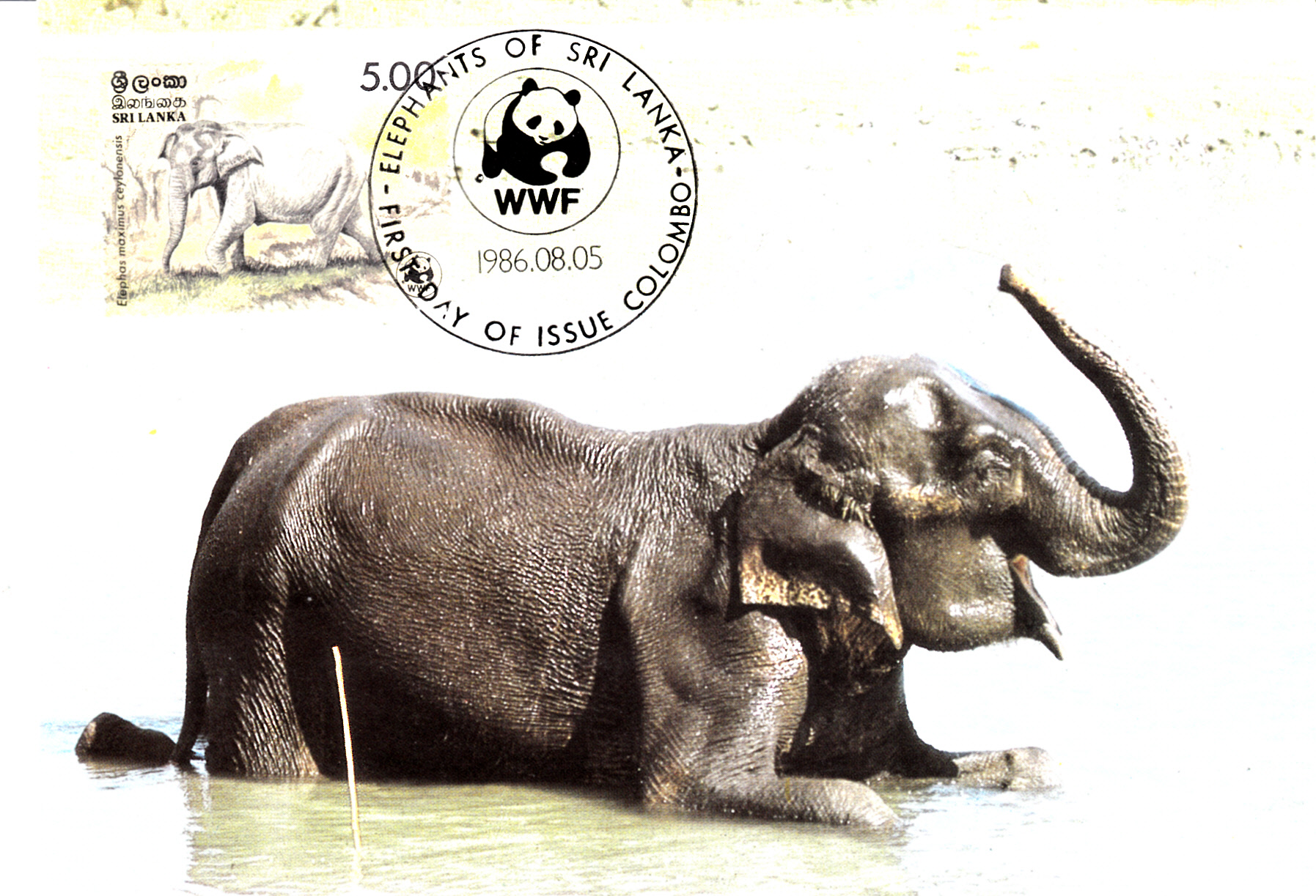 Diese Marke aus Sri Lanka (MiNr 754) zeigt eine Elefantenkuh mit einem jungen Elefanten der Unterart Sri-Lanka-Elefant (Elephas maximus maximus).