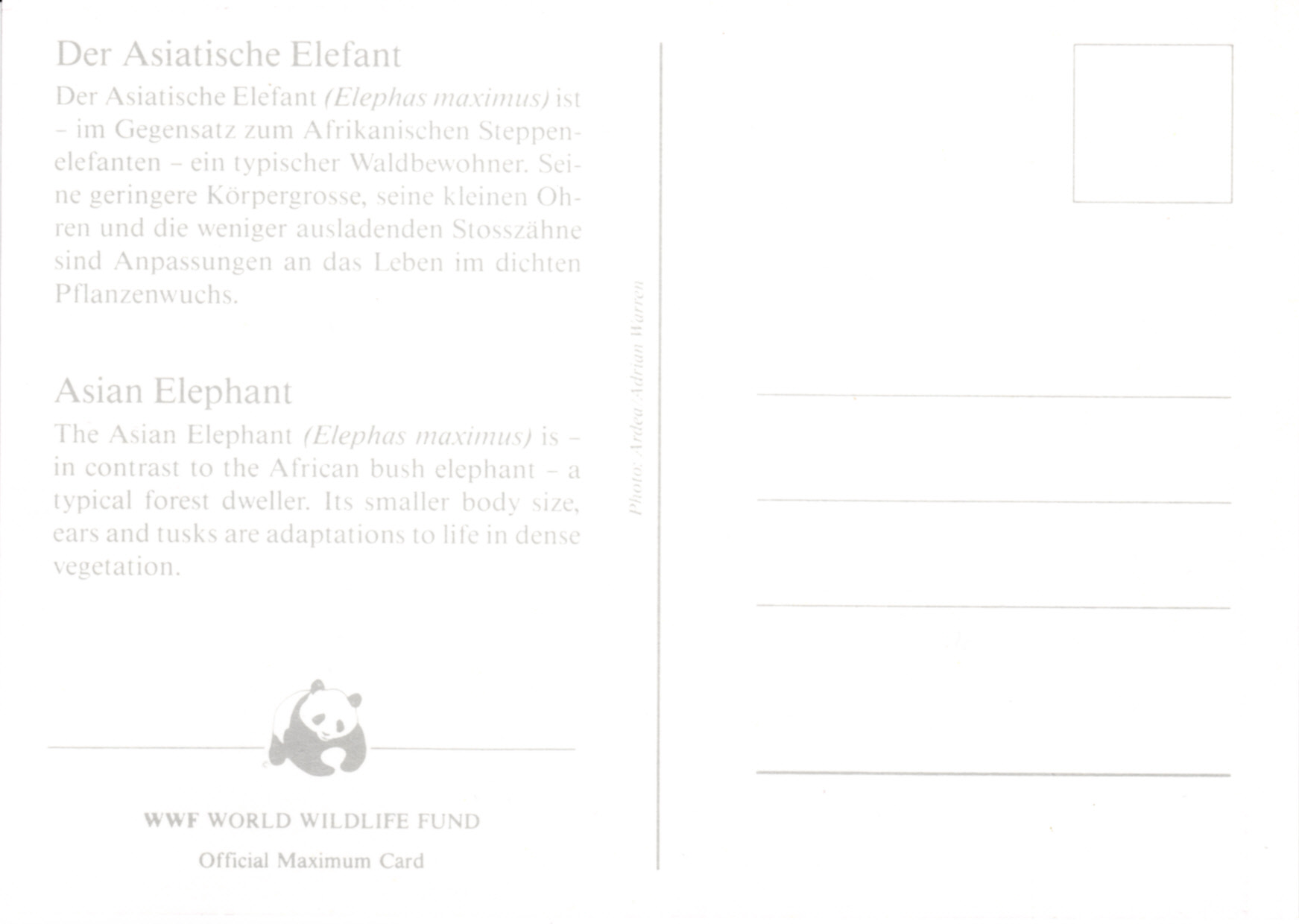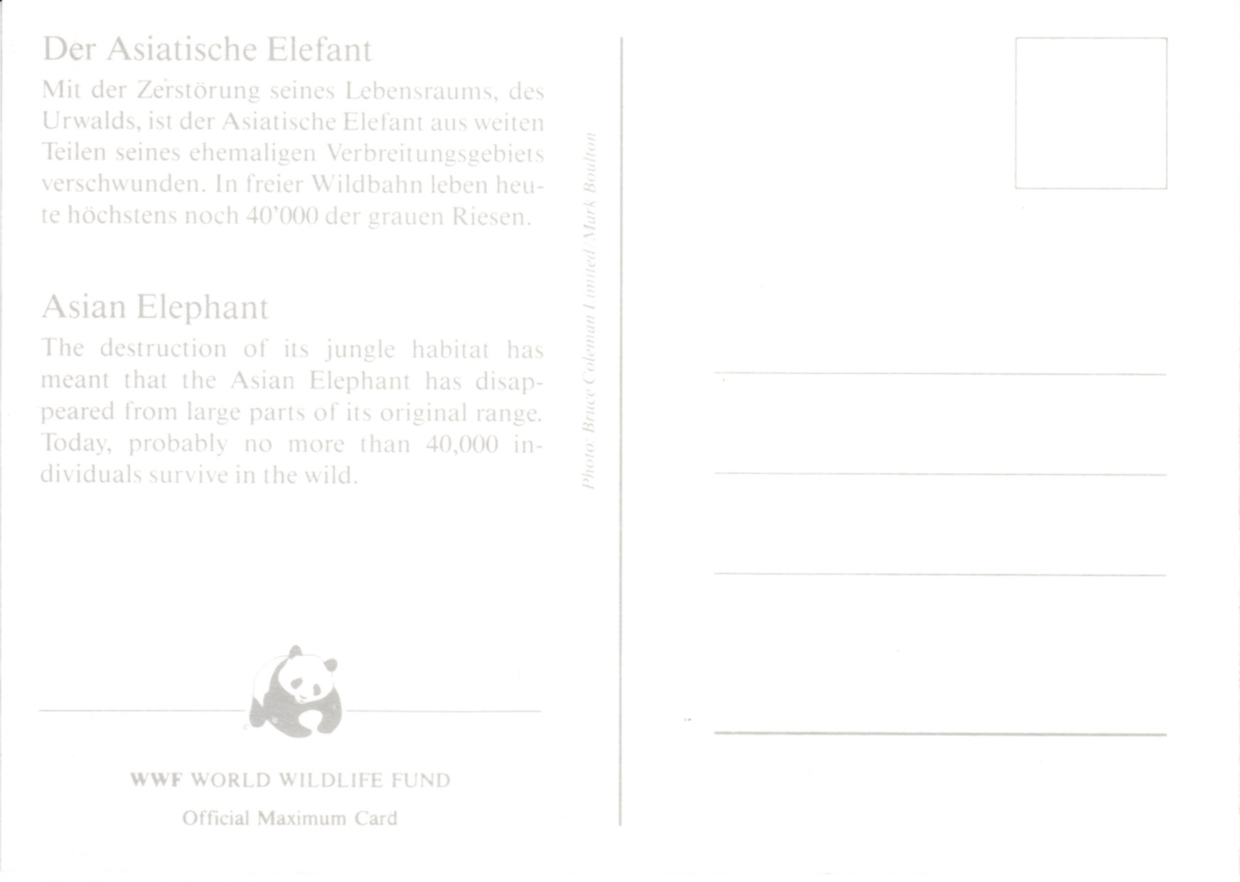 Hier die ersten beiden Karten. Auf der Anschriftenseite der Karten sind jeweils kurze Texte in Deutsch und Englisch zu den Asiatischen Elefanten zu lesen.