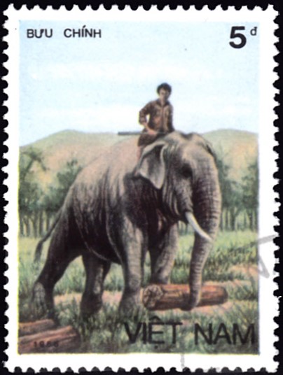 In einer Serie "Geschützte Tiere" erschien in Vietnam auch diese Marke (MiNr 1415) mit einem Indischen Elefant (Elephas maximus).