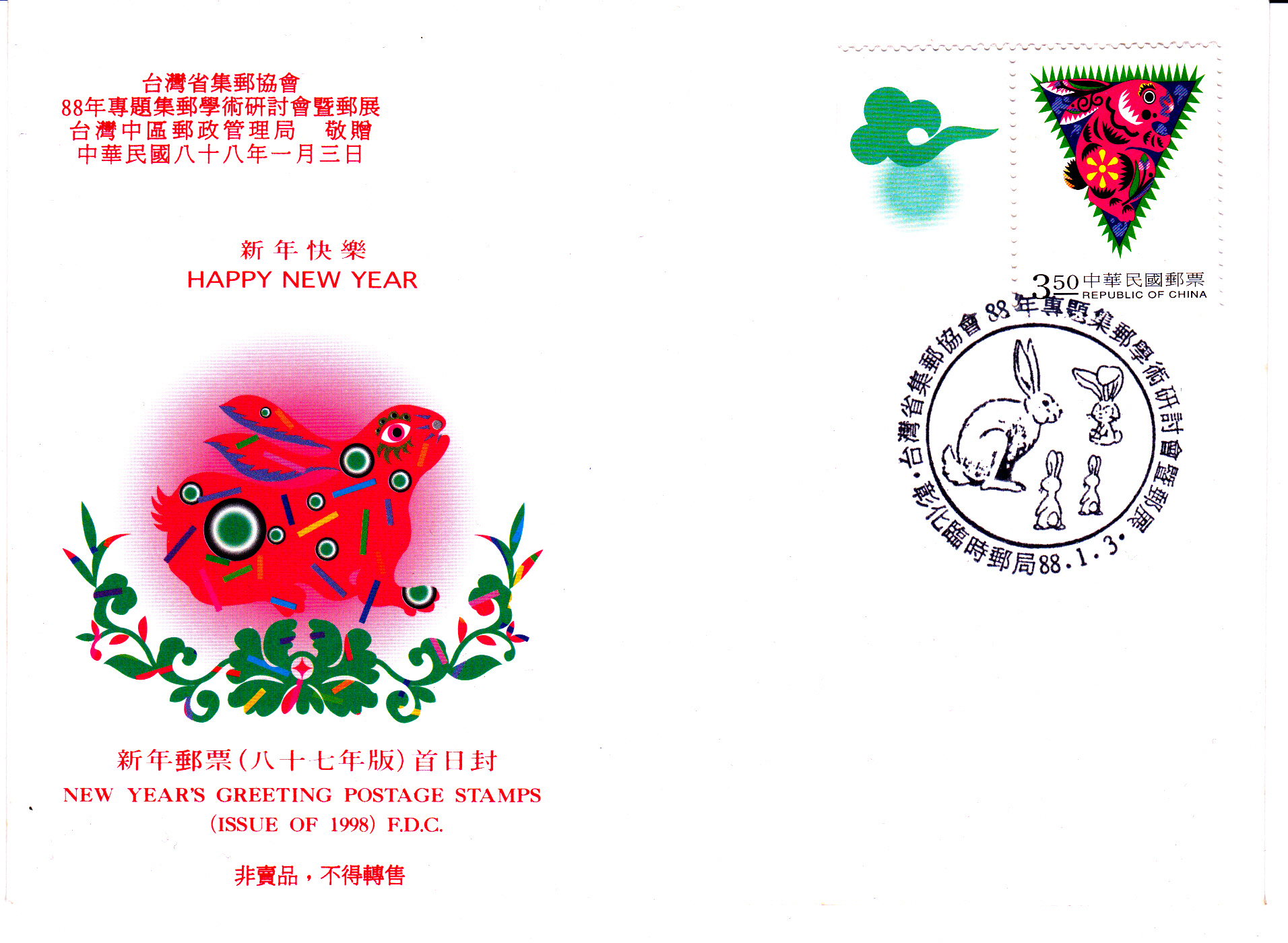 Diese Marke aus China Taiwan (MiNr 2493yA) zum Jahr des Hasen bildet im Markenbild einen Hasen im Dreieck ab. Der Sonderstempel zeigt ebenfalls vier schöne Hasenbilder.
