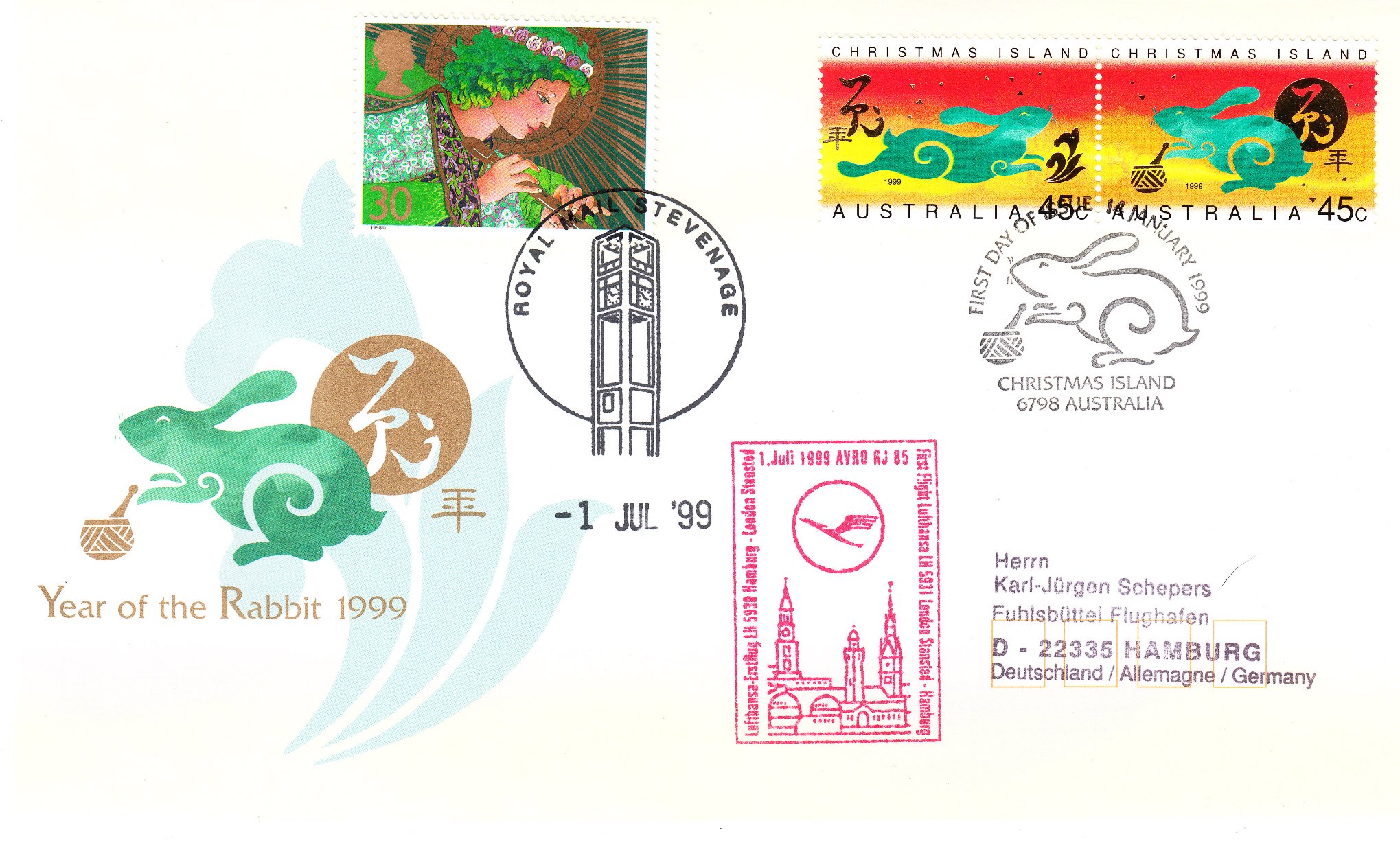 Der FDC diente dann am 01.07.1999 als Formular für einen Brief, der mit dem Lufthansa-Erstflug LH 5931 von London Stansted nach Hamburg befördert wurde und einen entsprechenden Cachetstempel in Rot erhielt. Als Frankatur diente eine Sondermarke auf GB der Wertstufe 30 Pence.