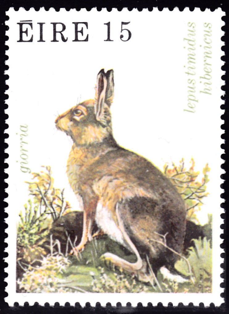 Aus Irland kommt diese Marke (MiNr 422), die einen Irischen Schneehasen (Lepus timidus hibernicus) zeigt.