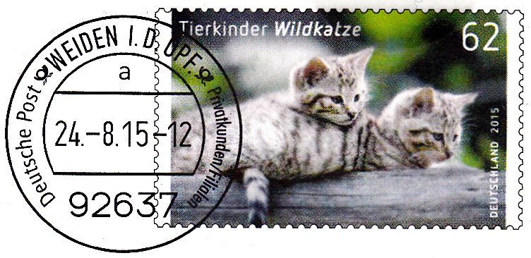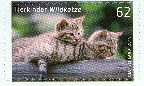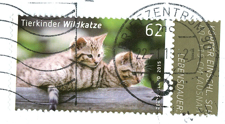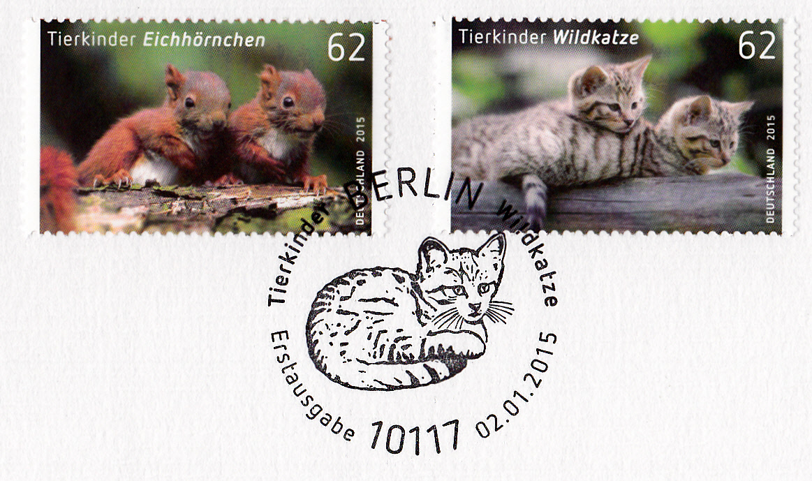 Im Ersttagsonderstempel Berlin zur Ausgabe "Tierkinder" (MiNr 3124/3125) vom 2.1.2015 ist passend zu einer der beiden Marken eine Wildkatze im Stempelbild zu sehen.