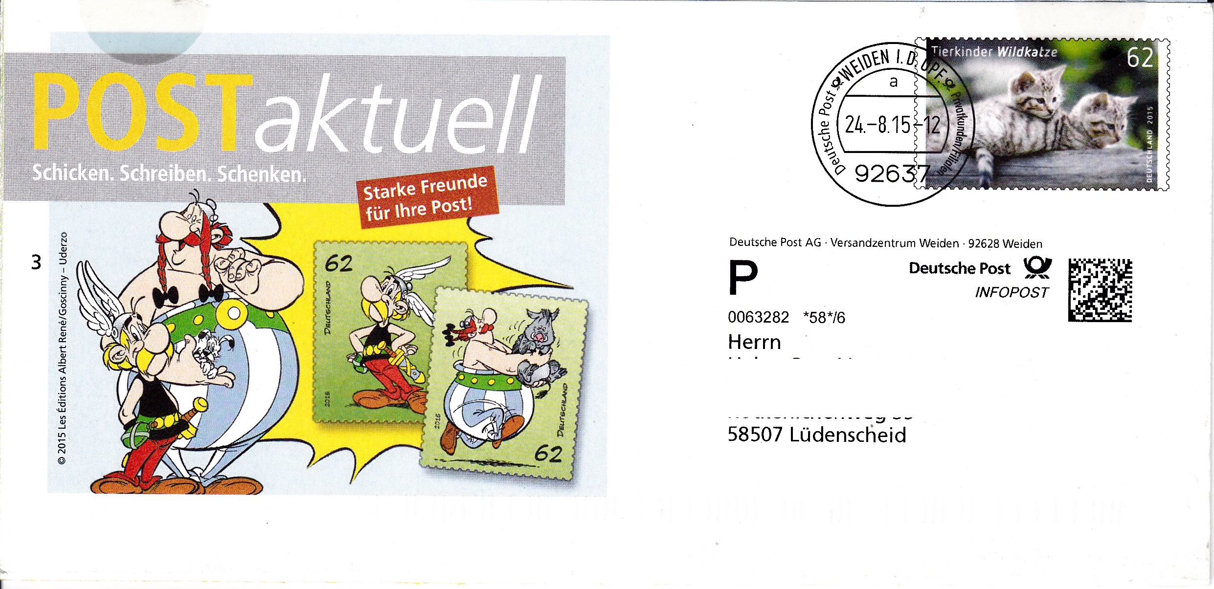 Faltbrief 210 mm x 102 mm mit Wertstempel "Tierbabys - Europäische Wildkatze (Felis silvestris silvestris)" (MiNr 3125) mit aufgedruckter Zähnung und Vorausentwertung "Deutsche Post (Posthorn) WEIDEN I.D.OPF (Posthorn) Privatkunden/Filialen / a / 24.-8.15-12". Es handelt sich um eine Eigenausgabe der Deutschen Post AG ohne Postlogo.