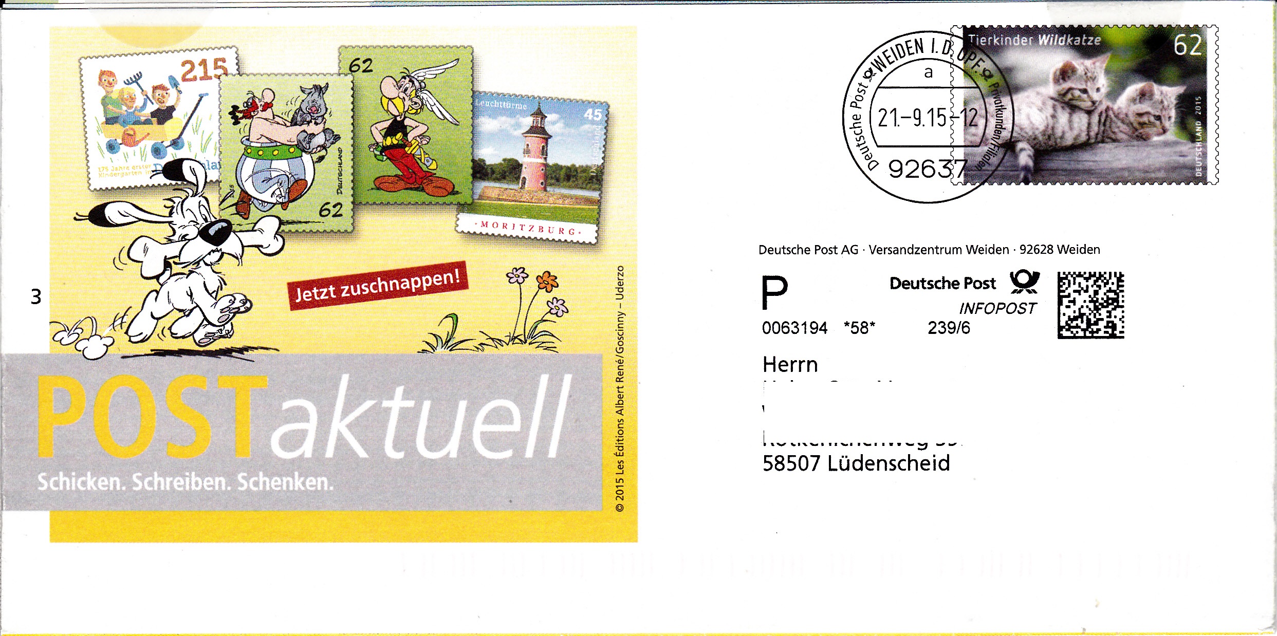 Faltbrief 210 mm x 102 mm mit Wertstempel "Tierbabys - Europäische Wildkatze (Felis silvestris silvestris)" (MiNr 3125) mit aufgedruckter Zähnung und Vorausentwertung "Deutsche Post (Posthorn) WEIDEN I.D.OPF (Posthorn) Privatkunden/Filialen / a / 21.-9.15-12". Es handelt sich wieder um eine Eigenausgabe der Deutschen Post AG ohne Postlogo.