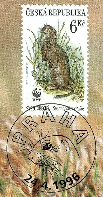 Diese Marke der Tschechische Republik (MiNr 112) bildet einen Europäischen Ziesel (Spermophilus citellus) ab. Michel nennt als Name Zieselmaus (Spermophilus citellus).