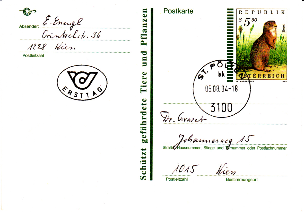 Hier eine Ganzsache (Postkarte) aus Österreich mit einem Werteindruck zu 5,50 Schilling, der ein Ziesel abbildet. Die Karte ist am Ausgabetag verschickt worden (5.8.1994), wie der Zusatzstempel "Ersttag" verrät.