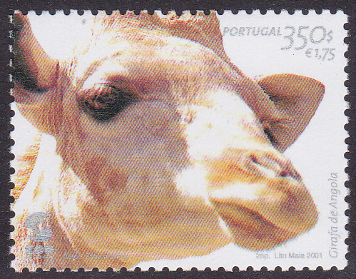 Diese Marke aus Portugal (MiNr 2520) zeigt den Kopf einer Giraffe (Giraffa camelopardalis) aus dem Zoologischen Garten von Lissabon.